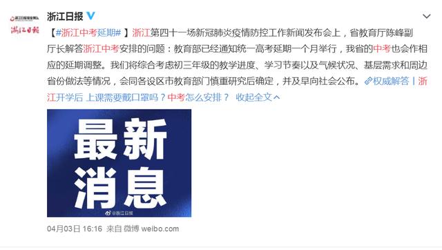 浙江第四十一场新冠肺炎疫情防控工作新闻发布会上,省教育厅陈峰副厅长解答浙江中考安排的问题:教育部已经通知统一高考延期一个月举行,浙江省的中考也会作相应的延期调整。将综合考虑初三年级的教学进度、学习节奏以及气候状况、基层需求和周边省份做法等情况,会同各设区市教育部门慎重研究后确定,并及早向社会公布。