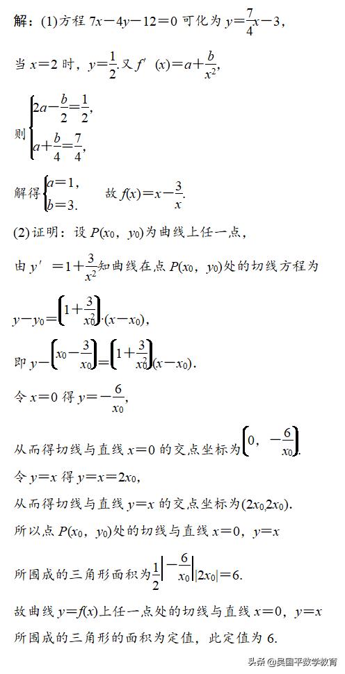 (2)证明:曲线y=f(x)上任一点处的切线与直线x=0和直线y=x所围成的三角形面积为定值,并求此定值.