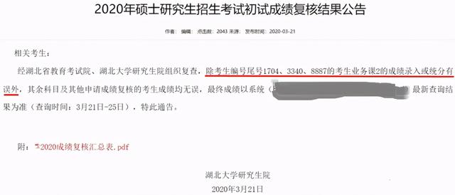 不过,在查询考研成绩的时候,也要提醒各位考生要小心,如果查询到的成绩跟自己预估的分数差距太大,特别是业务课的成绩,那么很有必要向报考申请复核。根据历年的经验来看,成绩出错的事情确实有过。比如,湖北大学就曾经在过去的两年(2019年和2020年)里,出现了多位考生业务课成绩录入或统计分数时出现了错误的情况,最后学校也及时纠正了错误的成绩,并发布了相应的公告。